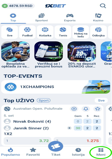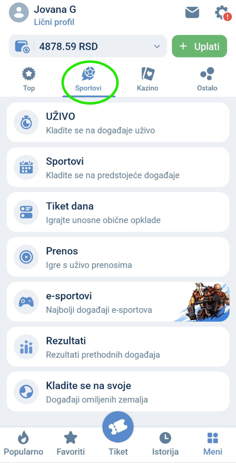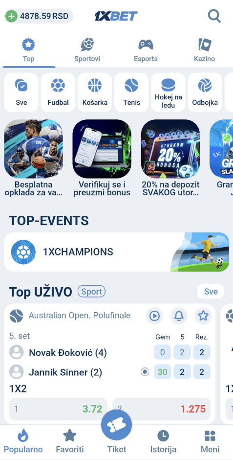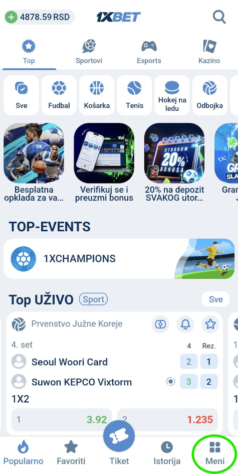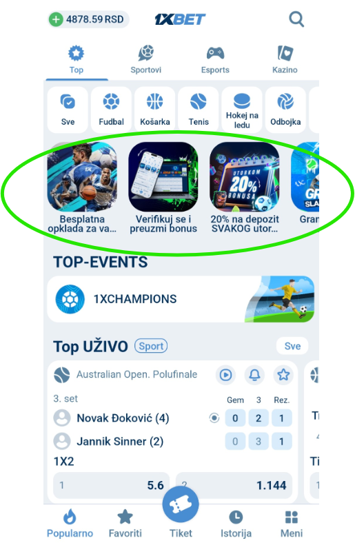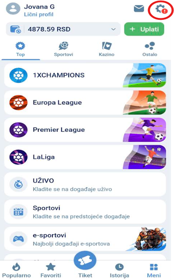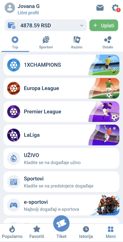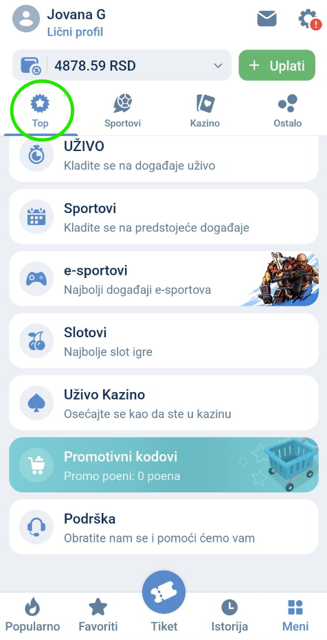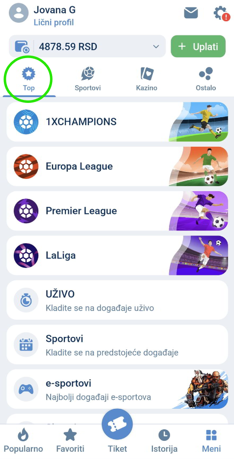 Opcija Top prikazuje istaknuta takmičenja i brze prečice ka najvažnijim delovima ponude.