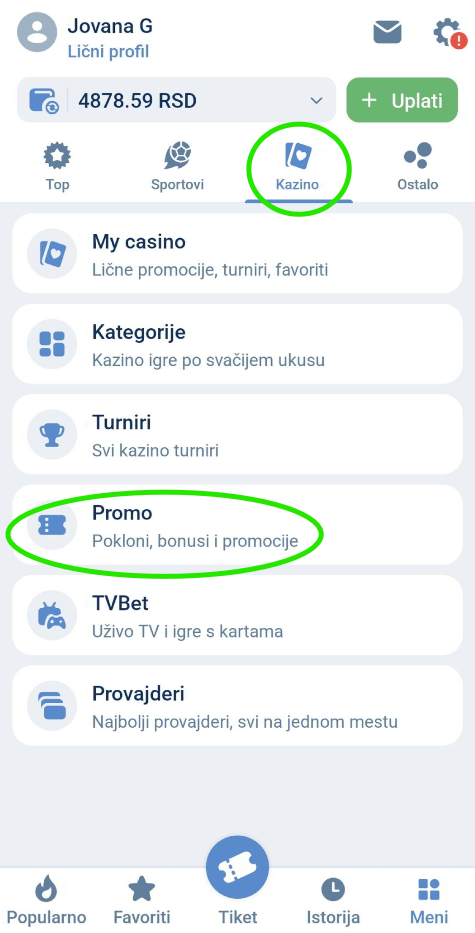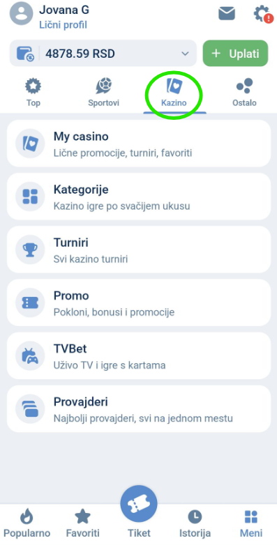 Opcija Kazino služi za pristup svim kazino igrama, promocijama i turnirima.