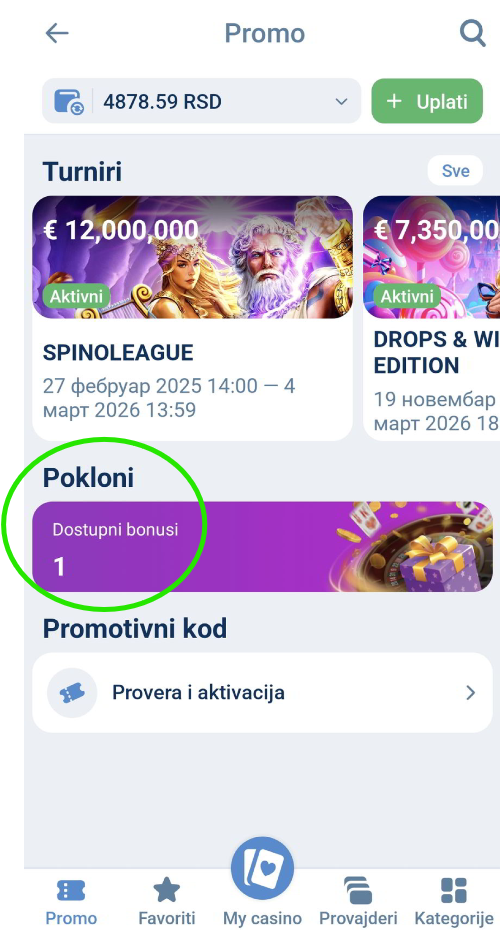 - U okviru sekcije Promo izaberite opciju Pokloni, gde se prikazuju svi dostupni bonusi.