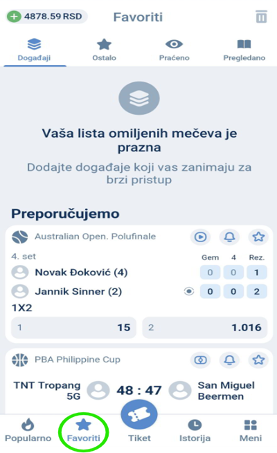 Personalizujte svoje iskustvo korišćenja aplikacije dodavanjem omiljenih događaja u sekciju Favoriti. Jednim klikom možete sačuvati željene mečeve i lige za brz pristup prilikom svakog ulaska u aplikaciju. Favoritima se pristupa preko donjeg menija: Favoriti (ikona zvezdice ⭐).