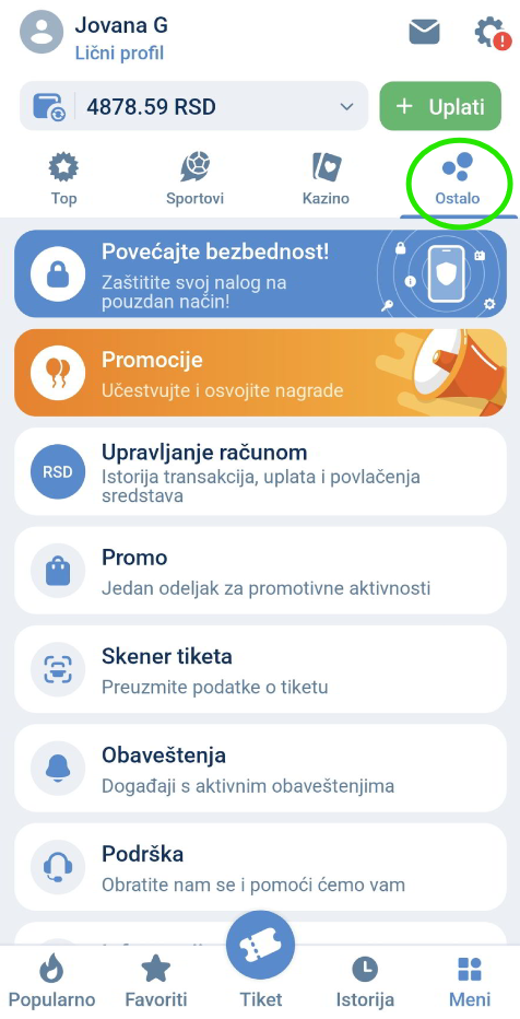 Opcija Ostalo služi za pristup podešavanjima naloga, promocijama i pomoćnim funkcijama aplikacije.