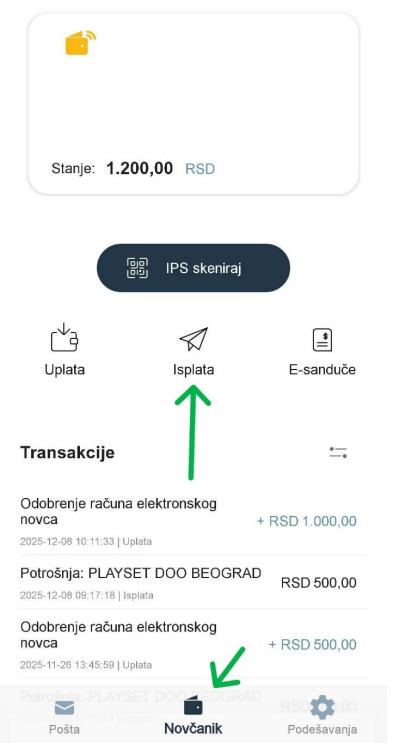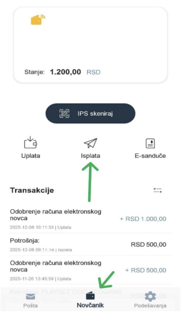 - Izaberite srednji taster „Isplata“ kako biste preneli sredstva sa novčanika na Vaš korisnički nalog.