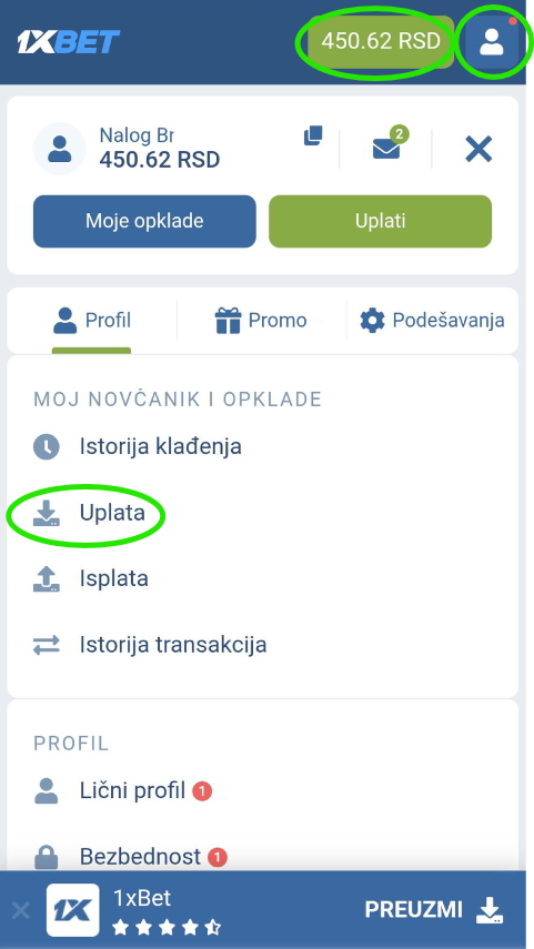 - Prijavite se na svoj nalog i otvorite karticu Uplata u gornjem desnom uglu, označenu zelenom bojom, ili kliknite na ikonu korisnika i izaberite opciju Uplata.