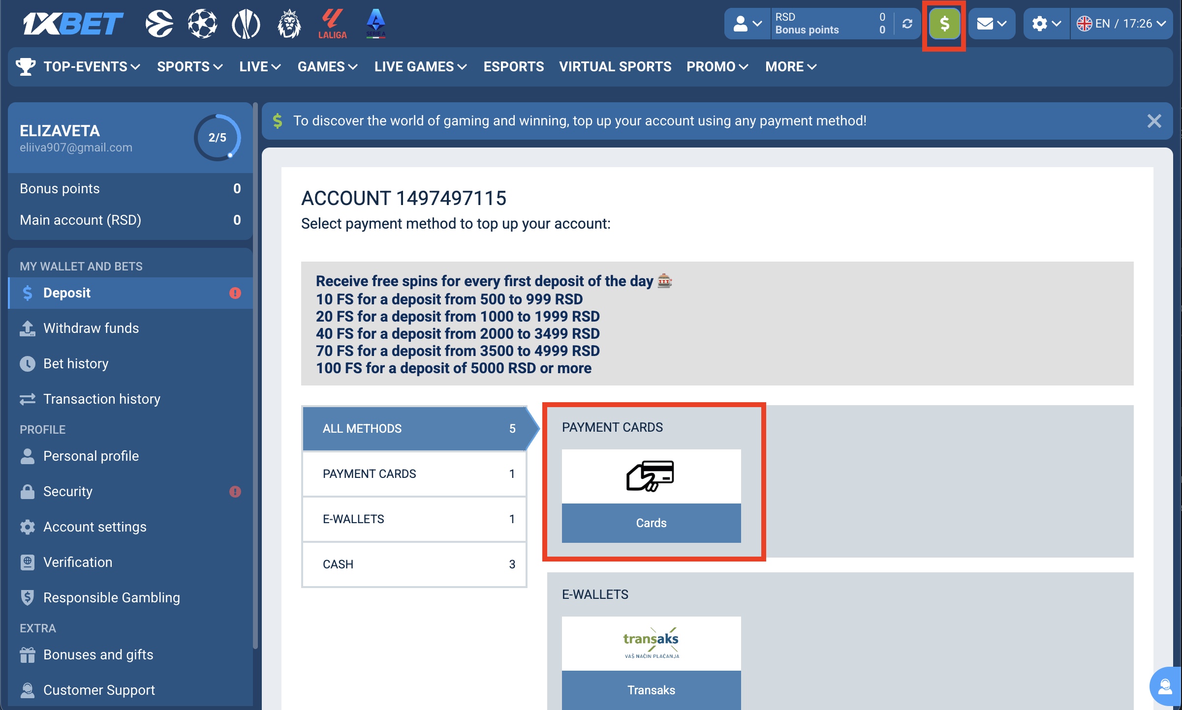 5. Prijavite se na svoj 1xBet nalog i otvorite karticu Uplata u gornjem desnom uglu, označenu zelenom bojom, ili kliknite na ikonu korisnika i iz padajućeg menija izaberite opciju Uplata. Izaberite opciju e-novčanici → Transaks, a zatim unesite: