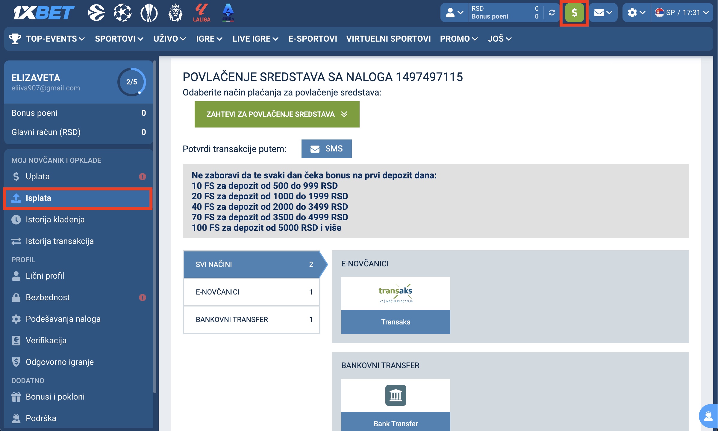 Kako biste isplatili sredstva sa Vašeg naloga, kliknite na ikonu korisnika u gornjem desnom uglu ekrana i iz padajućeg menija izaberite opciju Isplata, zatim odaberite željeni način isplate.