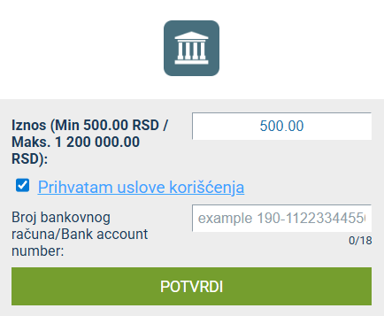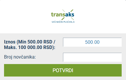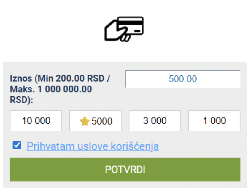 - Unesite iznos koji želite da uplatite ili izaberite jednu od ponuđenih vrednosti. Potvrdite da prihvatate uslove korišćenja i kliknite na Potvrdi
