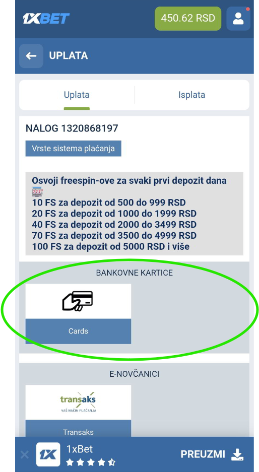 Depozit možete uplatiti brzo i jednostavno, koristeći jedan od dostupnih načina plaćanja: bankovnu karticu, e-novčanik (Transaks) ili gotovinu (PaySpot, Tenfore, Alta).
