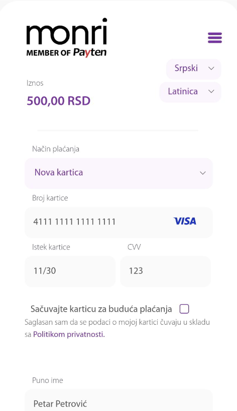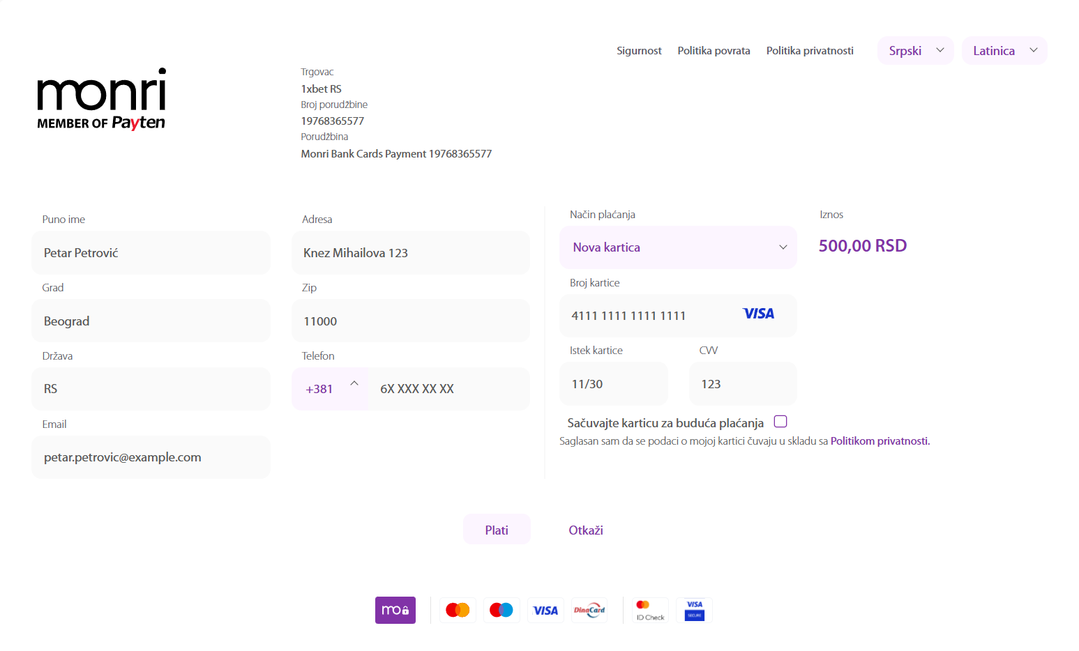 - U sledećem koraku unesite podatke sa kartice i kliknite na „Plati“ kako biste potvrdili uplatu. Takođe, karticu možete sačuvati za buduća plaćanja tako što ćete označiti opciju „Sačuvajte karticu za buduća plaćanja“.